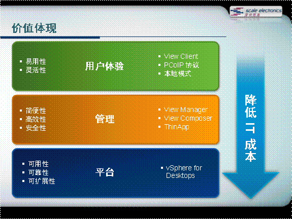 VMware View使用虛擬化技術(shù)切斷了桌面與關(guān)聯(lián)的操作系統(tǒng)、應(yīng)用程序和硬件之間的聯(lián)系,并將桌面操作系統(tǒng)、應(yīng)用程序和用戶數(shù)據(jù)封裝在隔離的層中,使 IT 人員可以獨立地更改,更新和部署每個組件,并根據(jù)用戶的角色分配不同的桌面操作系統(tǒng),應(yīng)用程序、用戶配置文件及用戶數(shù)據(jù)并將它們動態(tài)組合起來交付給最終用戶,將傳統(tǒng)的以設(shè)備為中心的IT桌面管理轉(zhuǎn)變?yōu)橐杂脩魹橹行牡腎T桌面應(yīng)用的“交付服務(wù)”。